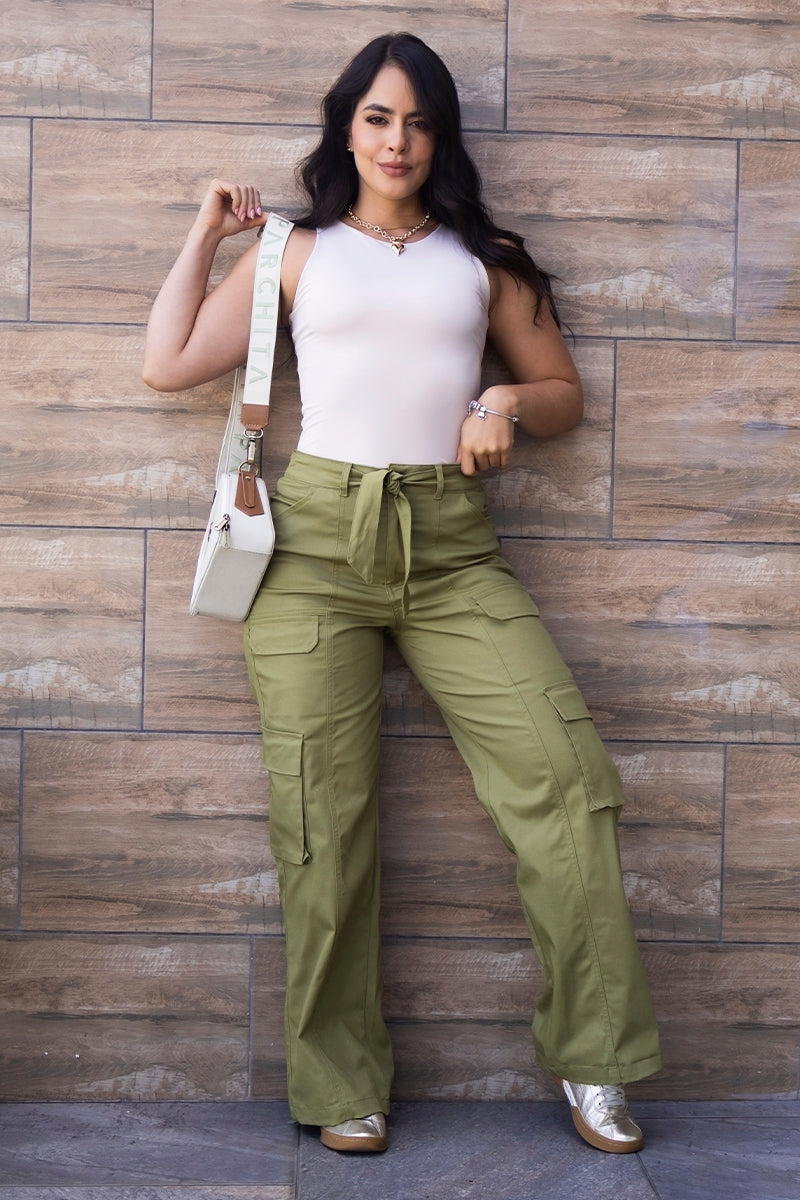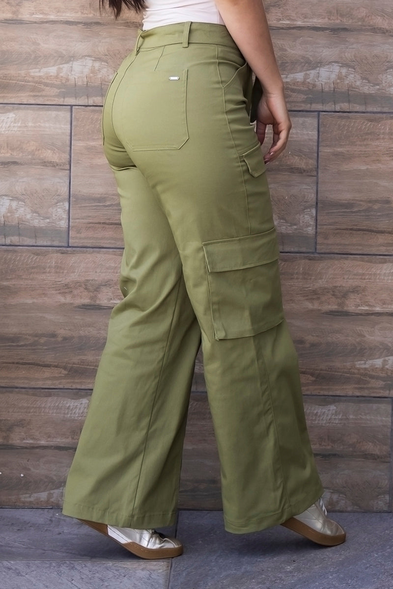 Pantalón Cargo Wide Leg Tiro Alto, Costura Frontal Irregular, Silueta Semi Holgada con elongación. Disponible en color Mocca, Matcha y Azul Cobalto.
