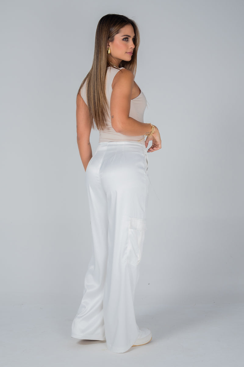 Pantalón Cargo, Tiro Alto, Efecto Satín, Bolsillos Frontales y laterales Funcionales, Pretina Interna con doble Botonadura y Cinta de anudar a tono. Silueta Semi Ajustada con elongación. Disponible en color Ivory, Camel y Negro.