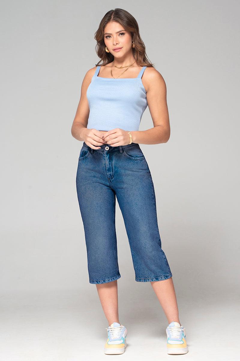 Bermuda Larga Denim Tiro Alto, bolsillos Frontales y posteriores funcionales.  Silueta ajustada Sin elongación. Disponible en Color Azul Medio