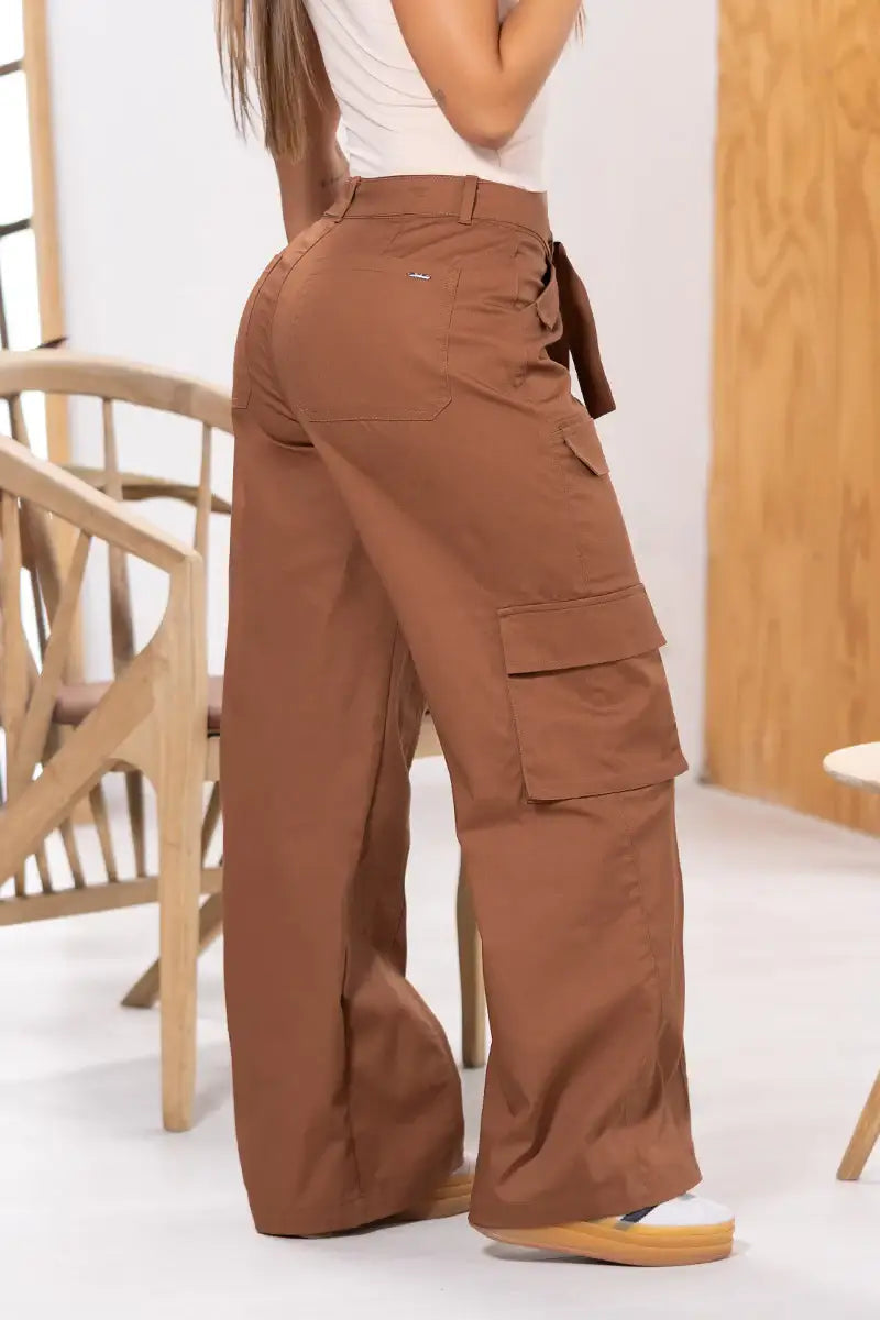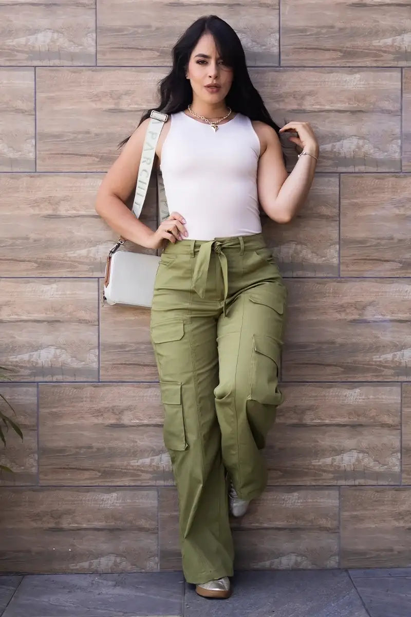 Pantalón Cargo Wide Leg Tiro Alto, Costura Frontal Irregular, Silueta Semi Holgada con elongación. Disponible en color Mocca, Matcha y Azul Cobalto.
