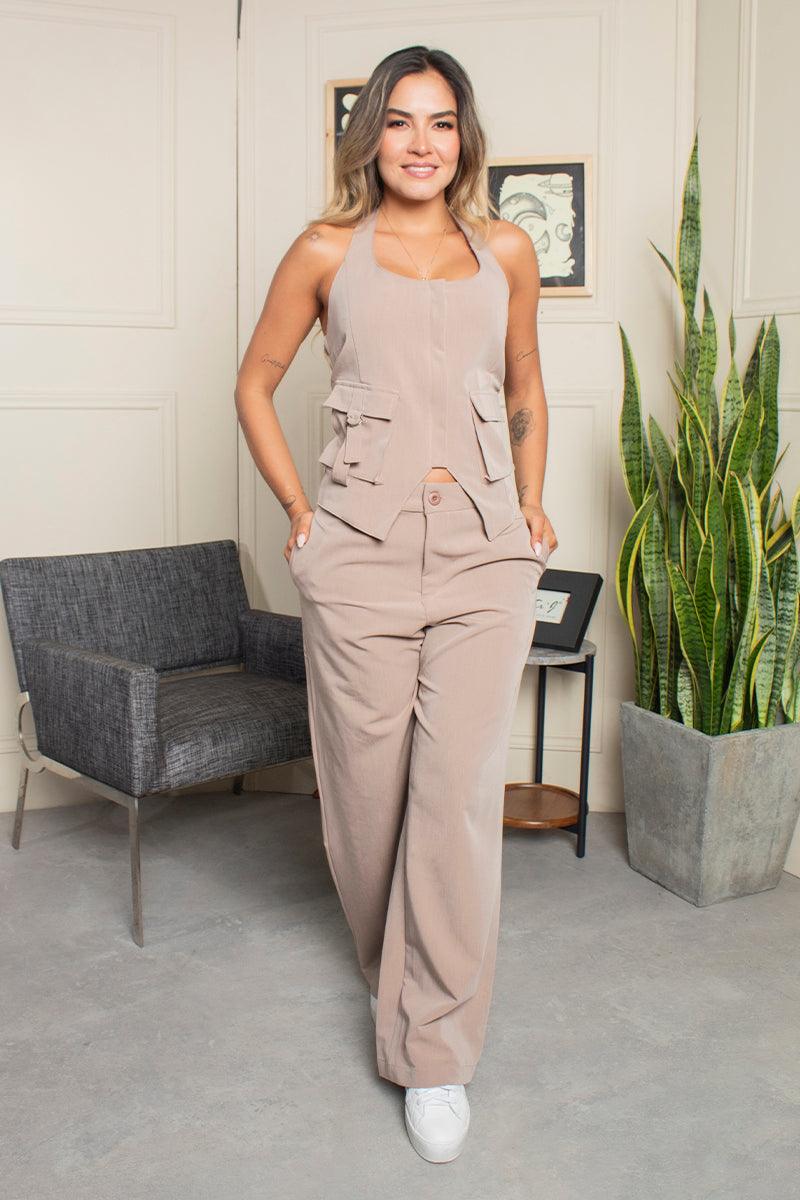 Set 2 Piezas Pantalón Tiro Alto, bota Recta, Bolsillos Frontales. Chaqueta Halter Con Bolsillos Cargo Con Tabilla y Tapa, Espalda Resortada, Botonadura Frontal Cubierta. Prenda con Elongación. Disponible en Color beige, Negro y Taupe.